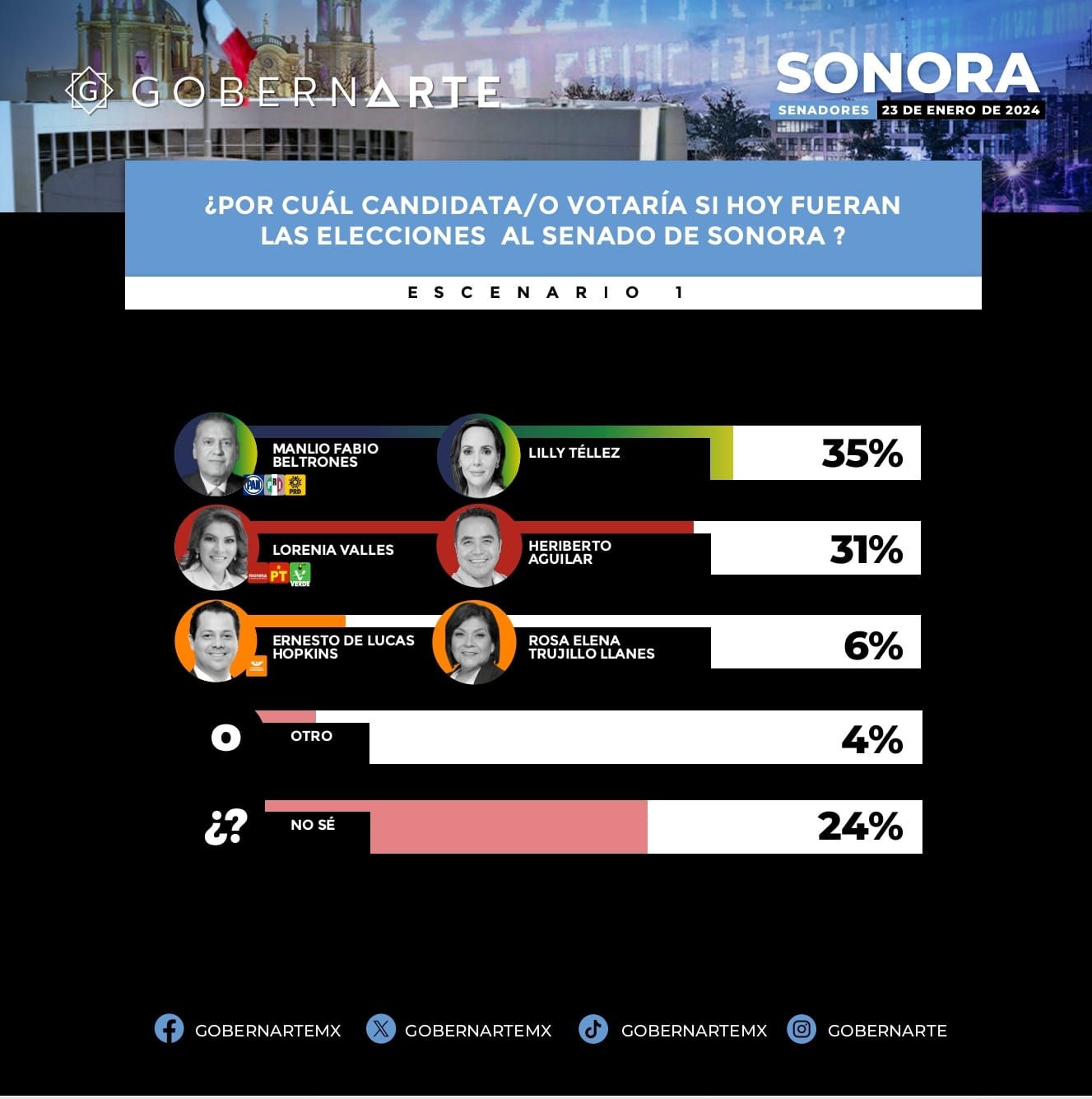 Hermosillo, Sonora. 24 de enero de 2024. Con una aprobación del 35%, la fórmula de la coalición ‘Fuerza y Corazón por Sonora’ para el Senado de la República que conforman Manlio Fabio Beltrones y Lilly Téllez, se posicionan como los favorecidos por las y los sonorenses para las elecciones del próximo 2 de junio.