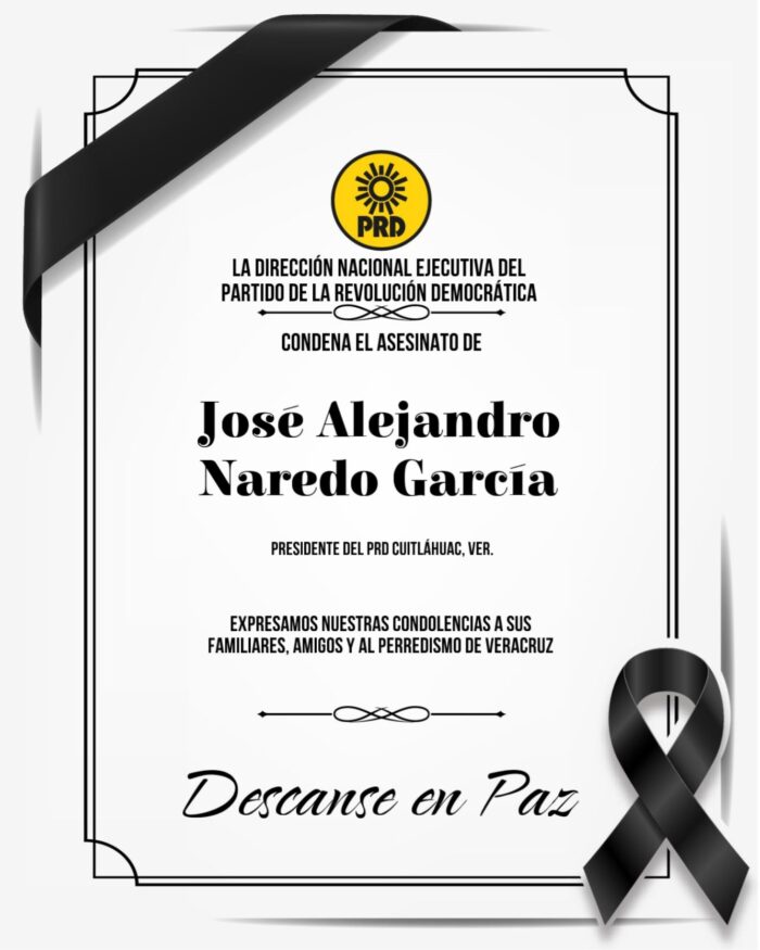 El dirigente del Partido de la Revolución Democrática (PRD) en Cuitláhuac, Veracruz, José Alejandro Naredo García, fue asesinado a balazos este sábado.