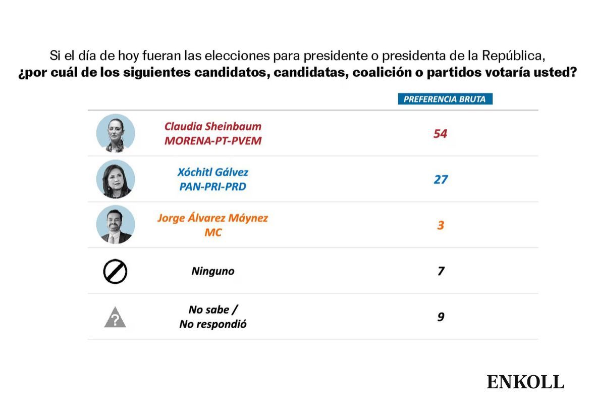 Enkoll da a Sheinbaum un 54% de las preferencias brutas, frente al 27% obtenido por Gálvez. Álvarez Máynez tiene un 3%. Las preferencias efectivas, que no consideran a quienes siguen indecisos ni a quienes no votarían por ninguno de los candidatos, ofrecen resultados similares: la aspirante de Morena se va hasta el 65%, la abanderada del frente opositor crece hasta el 32% y el contendiente por MC se queda en 3%.