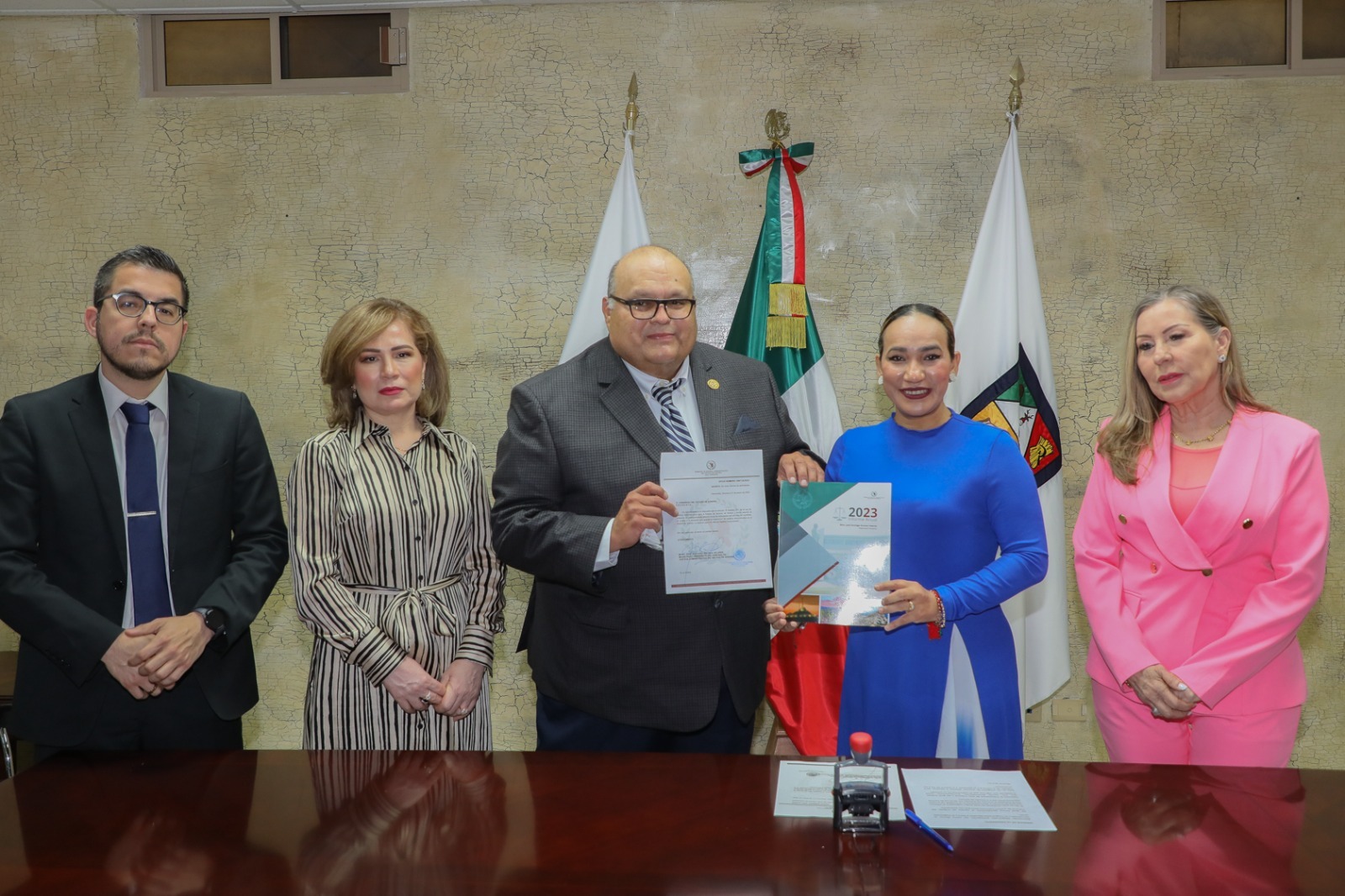 Hermosillo, Sonora; 31 de enero de 2024.- Para dar cabal cumplimiento a lo dispuesto por la Ley de Justicia Administrativa para el Estado de Sonora, la diputada presidenta de la mesa directiva de la Diputación Permanente, Claudia Zulema Bours Corral (PVEM), recibió de manos de José Santiago Encinas Velarde, magistrado presidente del Tribunal de Justicia Administrativa (TJA), el informe de actividades del ejercicio 2023.