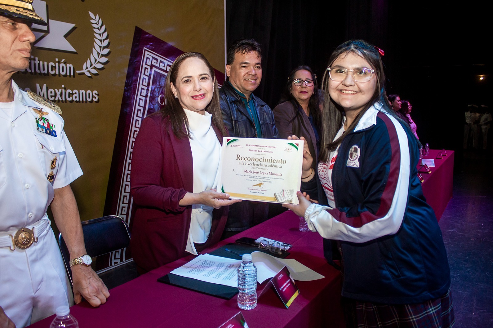 En representación de todos los jóvenes homenajeados, Frida Bonet Sosa, de la secundaria Federal 2 y María José Leyva Munguía de Colegio Vizcaya, recibieron por parte de la alcaldesa un cheque por su “Excelencia académica”; también a cada uno se les entregó reconocimiento por parte de las autoridades municipales y un paquete de libros proporcionados por el Instituto Sonorense de Cultura (ISC).