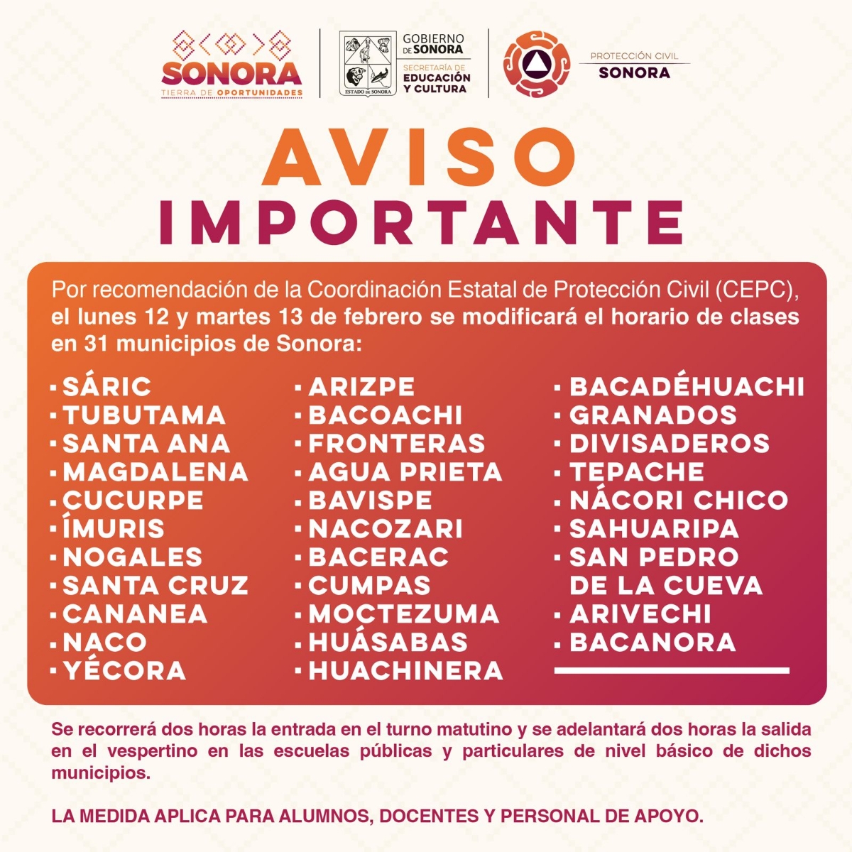 Hermosillo, Sonora; 11 de febrero de 2024.- Por recomendación de la Coordinación Estatal de Protección Civil (CEPC), el lunes 12 y martes 13 de febrero, se recorrerá dos horas la entrada en el turno matutino y se adelantará dos horas la salida en el turno vespertino en las escuelas públicas y privadas de nivel básico en 31 municipios de la entidad.