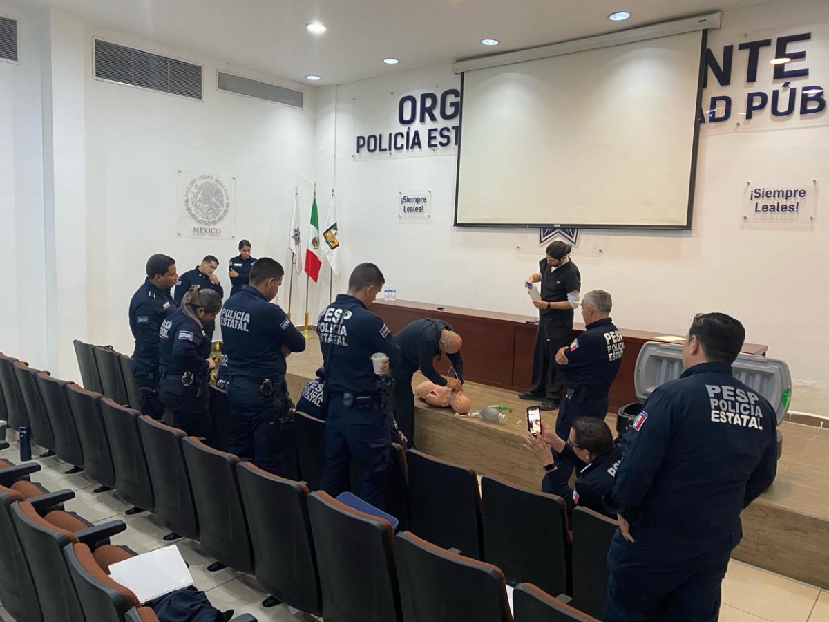 Son 17 mujeres y hombres de la PESP que participaron en la primera jornada de capacitación para reforzar los conocimientos y brindar un mejor servicio ante una situación de emergencia, por lo que, el entrenamiento estuvo dirigido por personal especializado de Cruz Roja e instructores Centro Regulador de Urgencias Médicas (CRUM), Hospital General del Estado y el Consejo Estatal de Prevención de Accidentes (Coepra), en las instalaciones de la Policía Estatal.