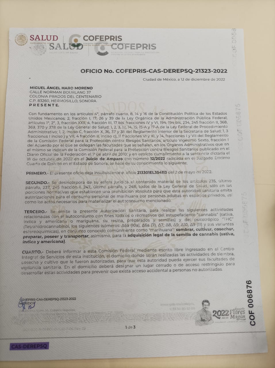 De los casos que él conoce porque algunos son sus amigos, en Sonora, aproximadamente son cinco personas más las que están buscando un permiso ante Cofepris bajo el recurso del libre desarrollo de la personalidad para que se les permita usarla con fines recreativos.