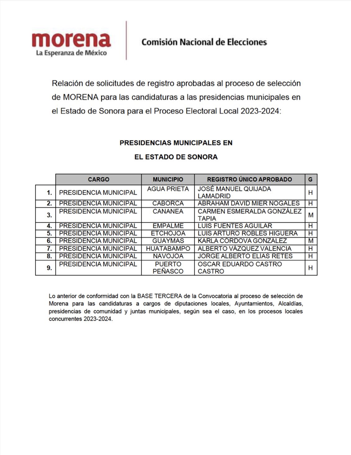 En el caso de las presidencias municipales, los perfiles que aparecen son José Manuel Quijada Lamadrid por Agua Prieta; Abraham David Mier Nogales en Caborca; Carmen Esmeralda González Tapia en Cananea; Luis Fuentes Aguilar en Empalme; Luis Arturo Robles Higuera en Etchojoa.