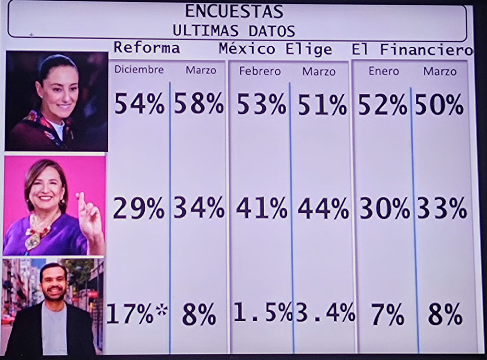 En el anterior sondeo de Reforma en diciembre, Sheinbaum sumó un 54% de las preferencias, frente a un 29% de Xóchitl y un 17% de Jorge Álvarez, candidato de la agrupación MC, que en el de marzo bajó a 8%.