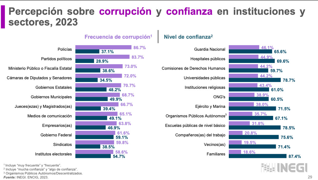 Son resultados de la Encuesta Nacional de Calidad e Impacto Gubernamental (Encig) 2023, realizada por el Instituto Nacional de Estadística y Geografía (Inegi).