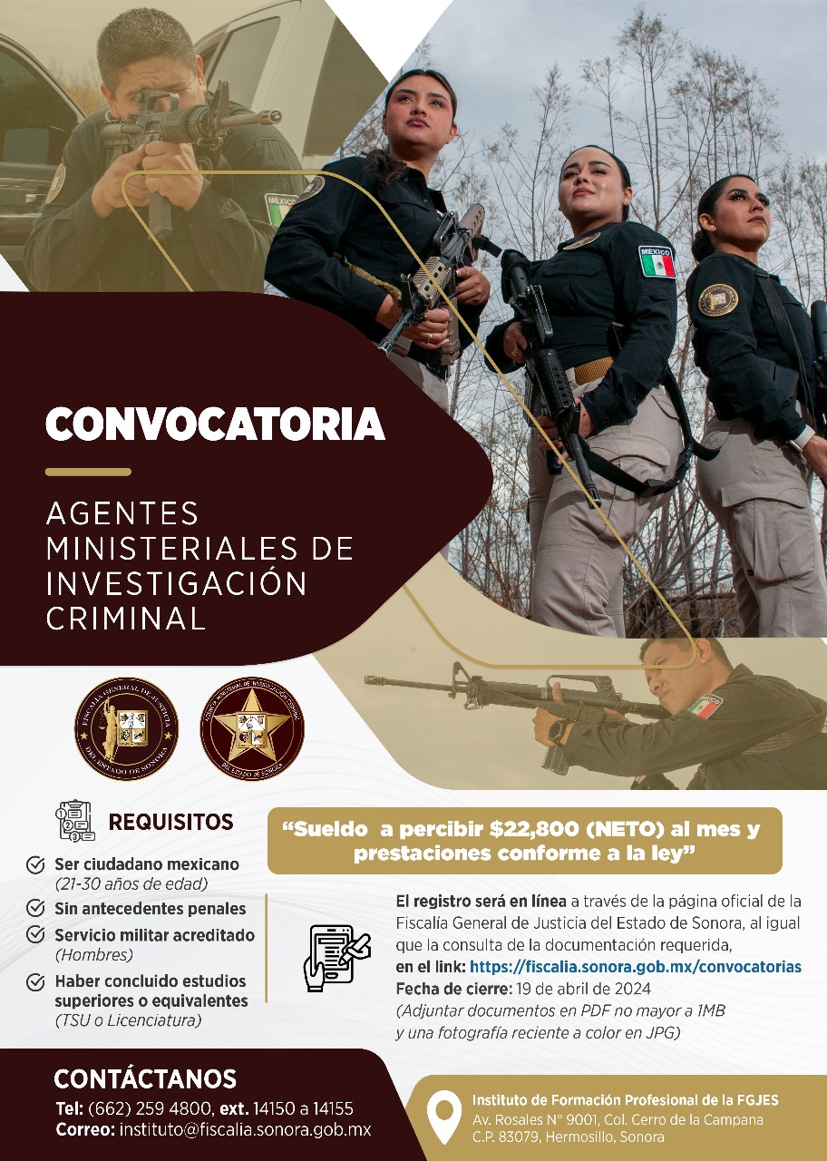 Hermosillo, Sonora, 22 de marzo de 2024.- Interesadas e interesados  en pertenecer a la Agencia Ministerial de Investigación Criminal (AMIC) ya pueden atender la convocatoria para el proceso de selección y formación como aspirante publicada por la Fiscalía General de Justicia del Estado de Sonora (FGJES).