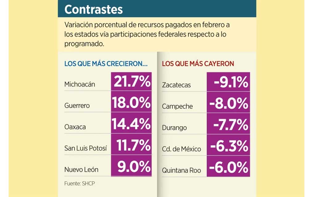 Monterrey, México.- Después de iniciar el 2024 con el pie derecho en el pago de participaciones federales a los estados, con un 25 por ciento más respecto a lo programado, en febrero el alza fue de a penas 1.8%.