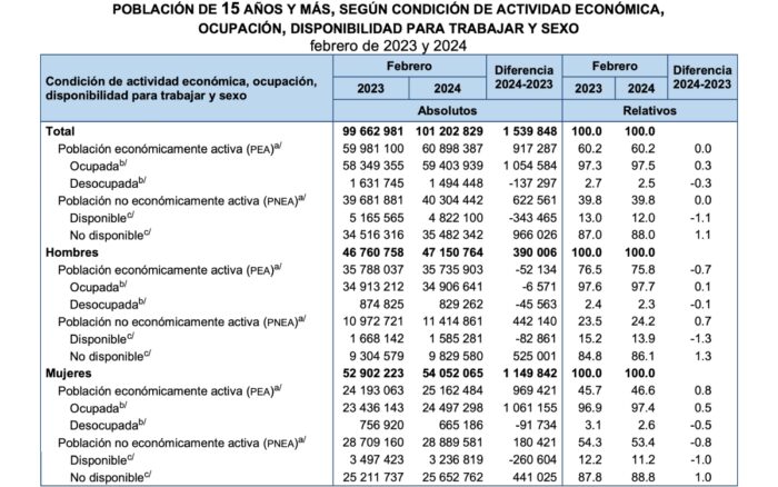 De acuerdo con este organismo, la PEA del segundo mes de 2024 fue de 60.9 millones de personas de 15 años y más, lo que representó una tasa de participación de 60.2% y una población activa superior en 917 mil a la del febrero de 2023.