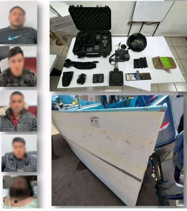 Se trata de José Adalberto 'N', Marlon 'N', José Ramsés 'N', Jesús Manuel 'N' y Kevin Darío 'N', quienes iban a bordo de una embarcación, misma donde se localizó droga, así como cargadores y cartuchos para arma de fuego. Durante esas acciones quedó asegurado un recipiente de plástico que contenía una libra de metanfetamina, cinco cargadores para arma de fuego, 65 cartuchos para arma de fuego calibre 9 milímetros, dos esposas.