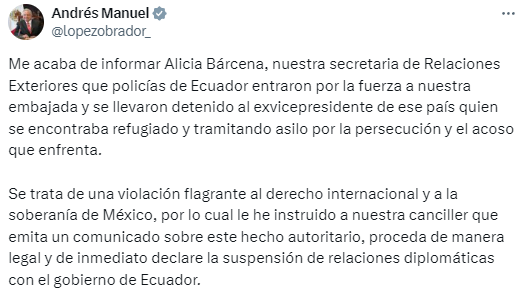 En redes sociales el mandatario mexicano dio a conocer la instrucción, luego de de enterarse que militares y policías ecuatorianos irrumpieron en la embajada de México en Ecuador para detener al exvicepresidente Jorge Glas, quien se encontraba allí desde diciembre pasado.