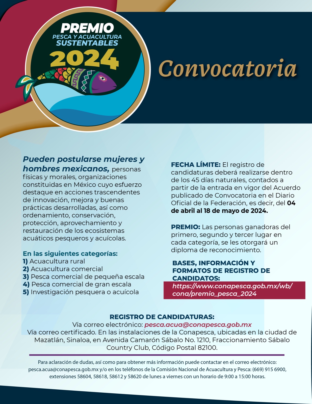Como ya es una tradición, se convoca al Premio a la Pesca y Acuacultura Sustentables 2024, mediante la presentación de postulaciones, a través de las cuales se reconoce a personas físicas y morales mexicanas cuyo esfuerzo destaque en la realización de acciones trascendentes, en los ecosistemas acuáticos pesqueros y acuícolas del país.
