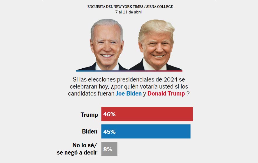 Biden y Trump ahora están prácticamente empatados, con Trump con una ventaja de 46 por ciento a 45 por ciento. Se trata de una mejora para Biden con respecto a finales de febrero, cuando Trump tenía una ventaja más sólida del 48 por ciento al 43 por ciento justo antes de convertirse en el presunto candidato republicano.