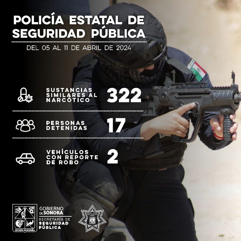En la semana del 5 al 11 de abril, la corporación participó en acciones contra el delito por los municipios de Sonora, donde elementos de seguridad registraron el arresto de 17 personas y la recuperación de dos vehículos con reporte de robo.