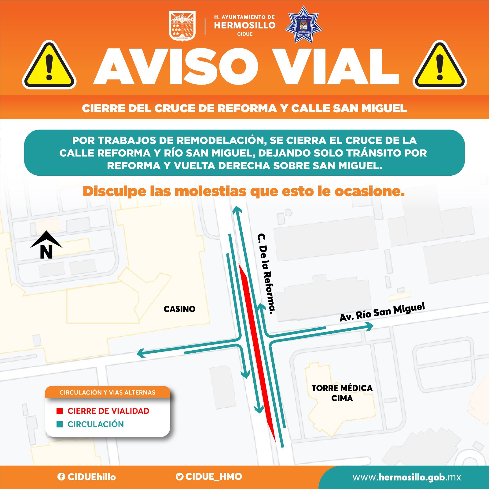 Hermosillo, Sonora, 24 de abril, 2024.- El Departamento de Tránsito Municipal mantiene vigilancia permanente para orientar al tráfico vehicular y peatonal, por cierre de las vialidades Reforma y Paseo San Miguel.