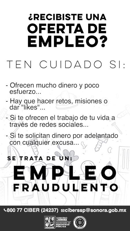 Ante esta modalidad de fraude, la Unidad Ciberética alertó a quien busca empleo a no caer en estafas evitando proporcionar información personal y en caso de requerir asesorías comunicarse al teléfono 800-77-Ciber (24237) y correo electrónico ciberssp@sonora.gob.mx