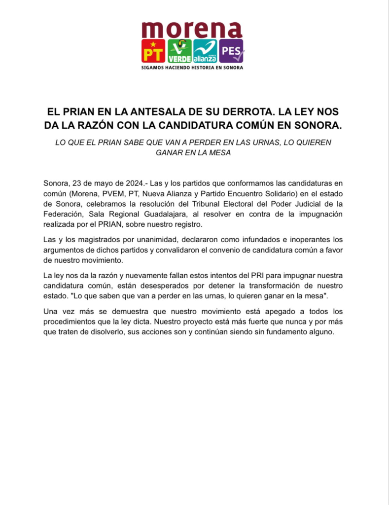 Sonora, 23 de mayo de 2024.- Las y los partidos que conformamos las candidaturas en común (Morena, PVEM, PT, Nueva Alianza y Partido Encuentro Solidario) en el estado de Sonora, celebramos la resolución del Tibunal Electoral del Poder Judicial de la Federación, Sala Regional Guadalajara, al resolver en contra de la impugnación realizada por el PRIAN, sobre nuestro registro.