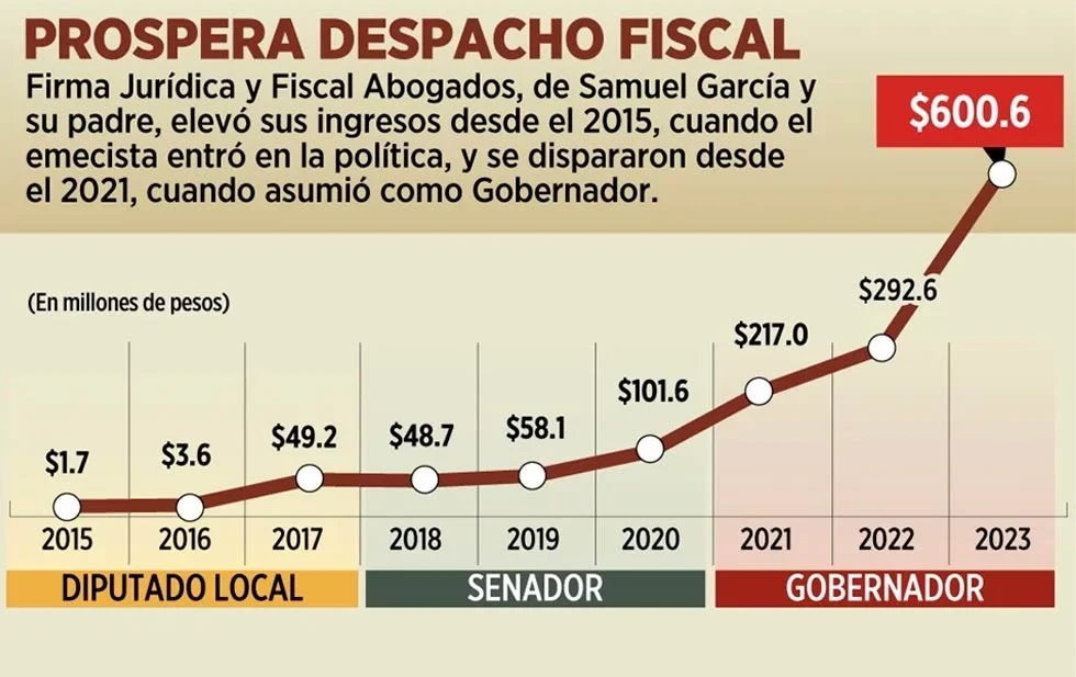 Monterrey, NL.- Desde el 2015, cuando Samuel García inició su carrera política, pero especialmente en el 2022 y el 2023 ya como Gobernador, los ingresos del despacho Firma Jurídica y Fiscal Abogados, del que el emecista es accionista junto con su padre, crecieron casi 360 veces.