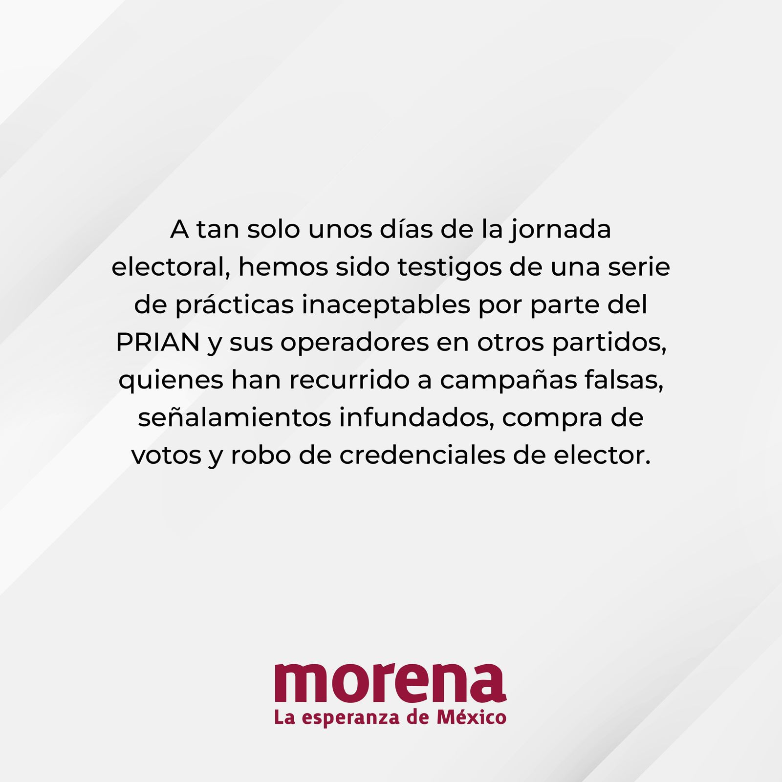 En estos momentos cruciales para el futuro de nuestro país, estado y ciudad, nos dirigimos a ustedes con un profundo sentido de responsabilidad y con la firme convicción de que la verdad y la transparencia siempre prevalecerán. A tan solo unos días de la jornada electoral, hemos sido testigos de una serie de prácticas inaceptables por parte del PRIAN y sus operadores en otros partidos, quienes han recurrido a campañas falsas, señalamientos infundados y a la compra de votos y credenciales.