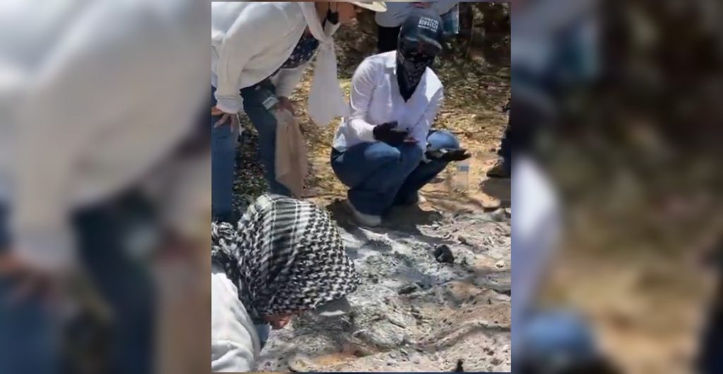 En redes sociales, la activista difundió un video en el que aparecen integrantes del colectivo de búsqueda rodeado un área cubierta con cenizas, unas tocan los restos con unas varas, mientras otras sólo observan y se escucha la voz de una mujer asegurando que hay un olor intenso.