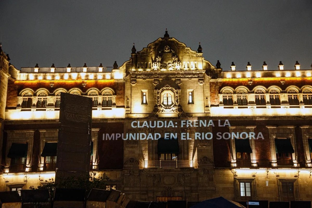 En la fachada de Palacio Nacional se leía: “Grupo México: dos sexenios en la impunidad”, “Claudia, no olvides al Río Sonora”, “Grupo México envenena al Río Sonora”, “10 años sin justicia en Río Sonora”, entre otros mensajes.