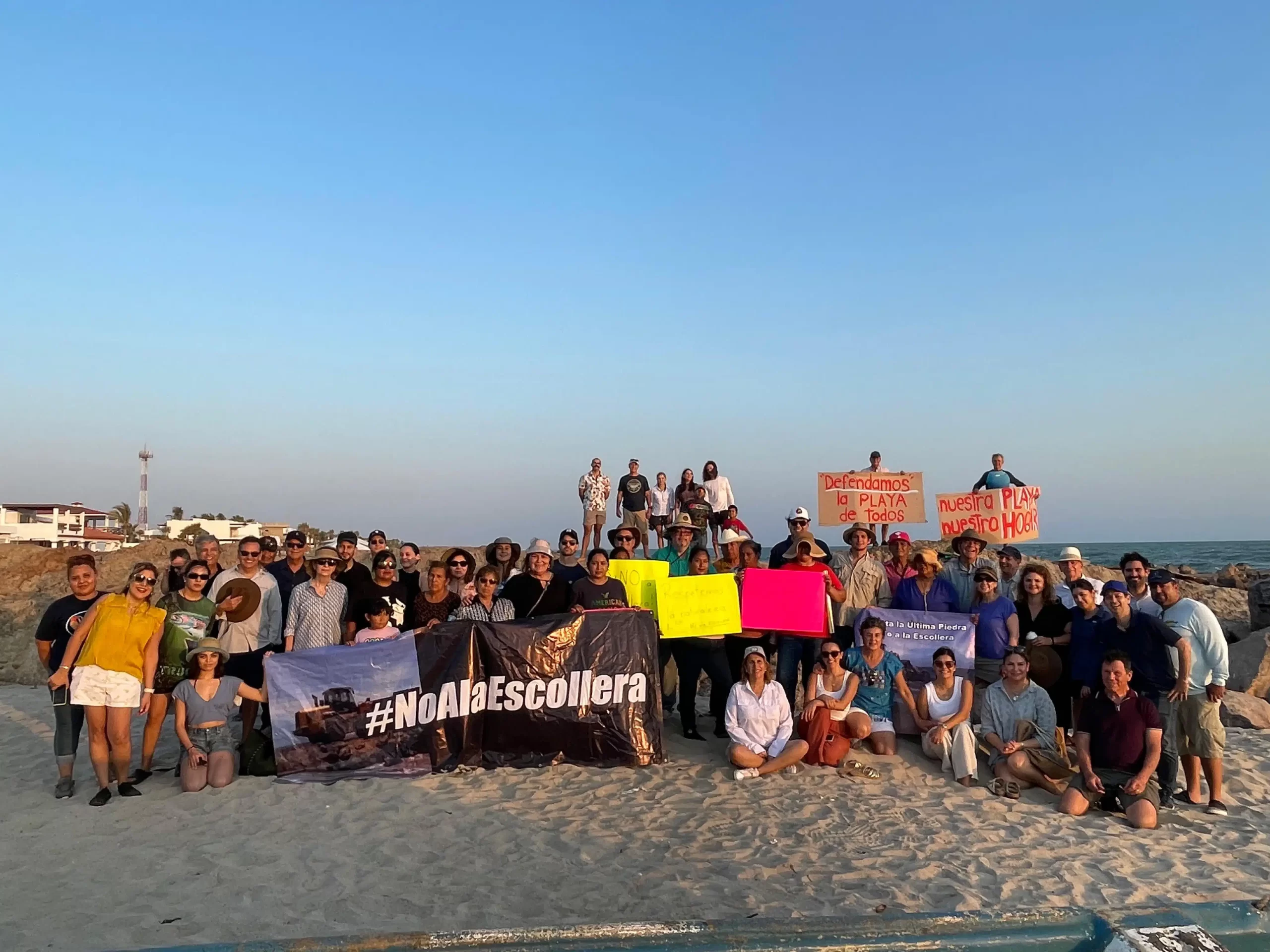 Camahuiroa, Sonora. Ciudadanos que tienen una vivienda en la playa Camahuiroa, ubicada en el municipio de Huatabampo, Sonora se manifestaron de manera pacífica debido a que un particular lleva a cabo trabajos de construcción de una escollera, creando un canal en la playa, situación que no fue notificada a los vecinos.