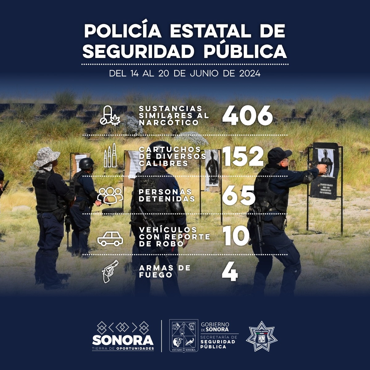 Hermosillo, Sonora; 21 de junio del 2024.- La Secretaría de Seguridad Pública, a través de la Policía Estatal de Seguridad Pública (PESP) en Sonora, realizó el aseguramiento de 65 personas en flagrancia delictiva, además, incuataron durante la semana armas de fuego y sustancias prohibidas.