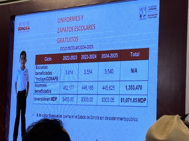 Para el ciclo escolar 2024-2025 la inversión global fue de 303 millones 50 mil pesos, que se traducen en 880 mil prendas y 440 mil pares de zapatos, brindando un alivio a la economía de las familias sonorenses con uniformes de calidad.