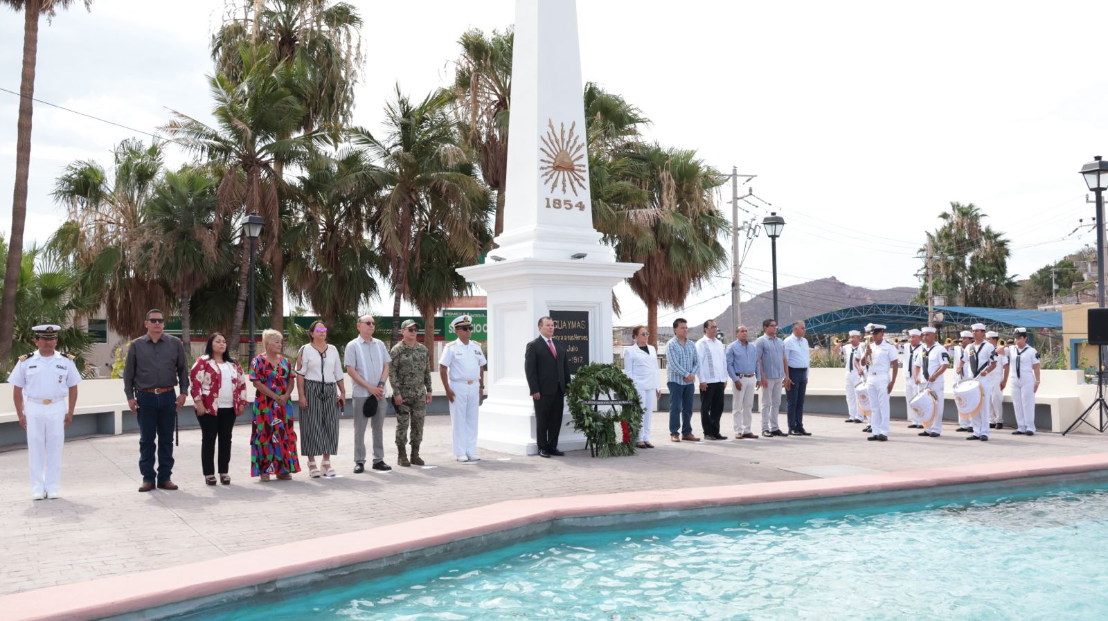 Posteriormente, la alcaldesa acudió al Obelisco, el Cronista de Guaymas señaló las palabras que escribió el General Yáñez, “en Sonora tiene la patria tan animosos y tan leales defensores de su integridad, que, llegado el caso de sostenerla, ni contarán el número de sus enemigos, ni retrocederán delante de ningún peligro. Soldados son éstos cuyo esfuerzo me consta de vista y cuyo esfuerzo ha sido superior a todo elogio”; y para concluir esta ceremonia conmemorativa la alcaldesa realizó junto con autoridades federales, estatales y municipales llevaron a cabo la colocación de ofrenda floral y guardia de honor.