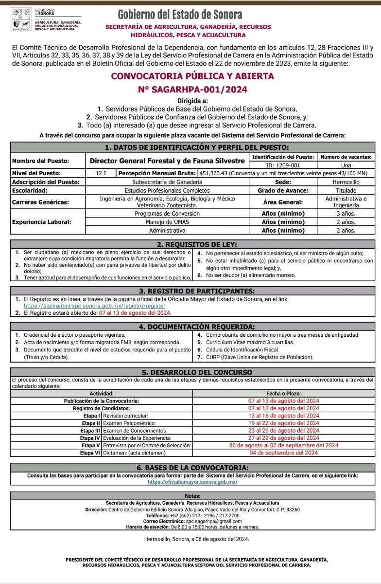 Hermosillo, Sonora; a 07 de agosto de 2024.- El Comité Técnico de Desarrollo Profesional de la Sagarhpa lanzó la convocatoria para ocupar la Dirección General Forestal y de Fauna Silvestre, el cual es el primer puesto que será ocupado en esta dependencia dentro de la modalidad del Sistema del Servicio Profesional de Carrera.