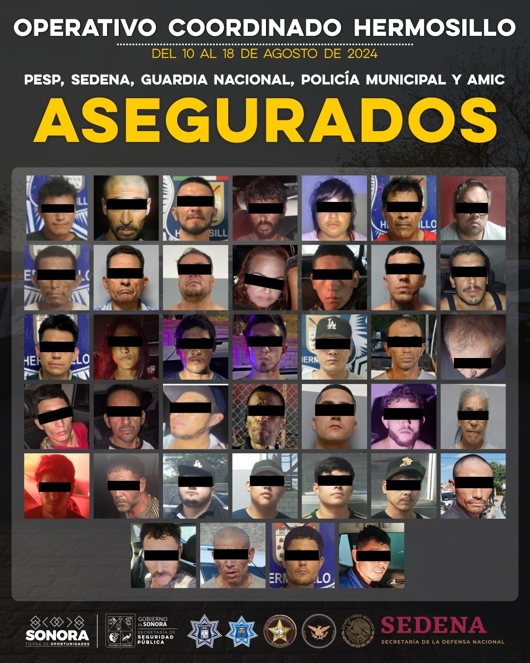 Hermosillo, Sonora; 19 de agosto de 2024.- En un esfuerzo conjunto para reforzar la seguridad en la capital sonorense, las corporaciones policiales de los tres niveles de gobierno lograron la detención de 53 personas durante acciones coordinadas para disminuir el delito en Hermosillo.