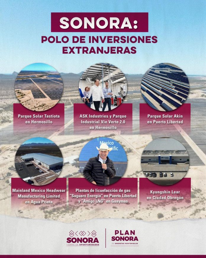 El plan Sonora de energía sostenible se ha convertido en la principal estrategia de atracción de inversión extranjera . Ejemplo claro de ello es la llegada de inversiones millonarias con proyectos a Cajeme, Agua Prieta, Hermosillo, Puerto Libertad y Guaymas.