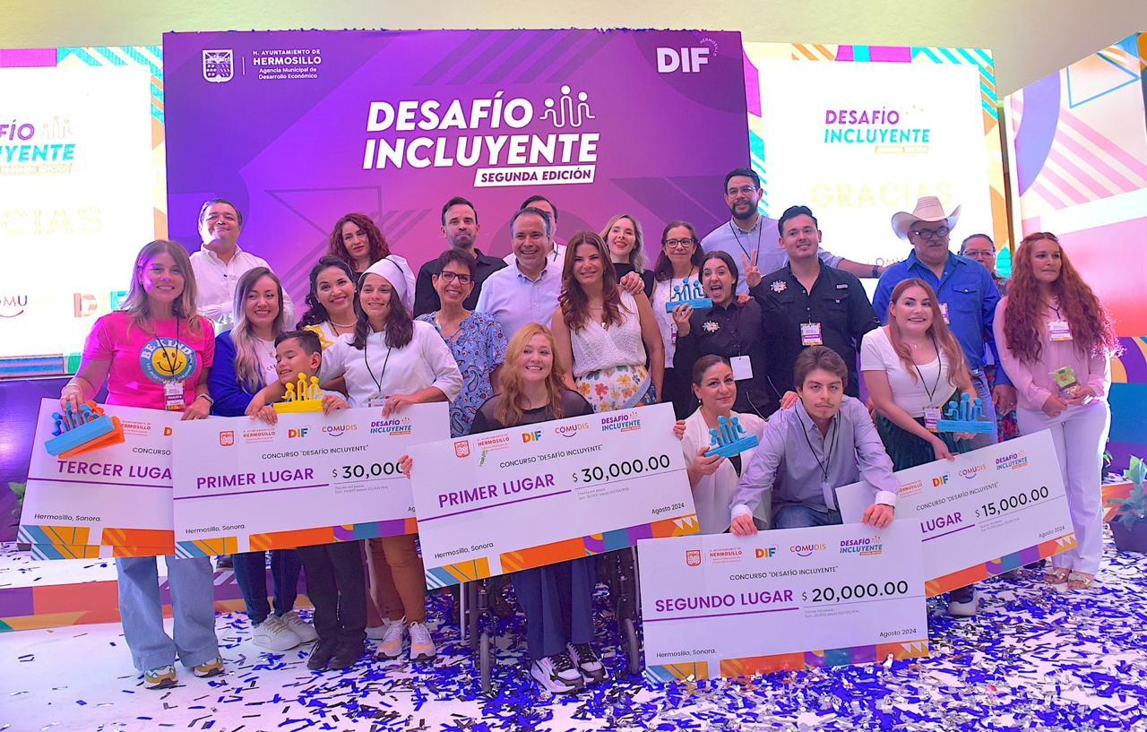 Hermosillo, Sonora; 23 de agosto, 2024.- El Presidente Municipal, Antonio Astiazarán Gutiérrez, y su esposa Patricia Ruibal Zaragoza, premiaron a los ganadores de la segunda edición de Desafío Incluyente, competencia para emprendedores con discapacidad o cuidadores de personas con discapacidad.