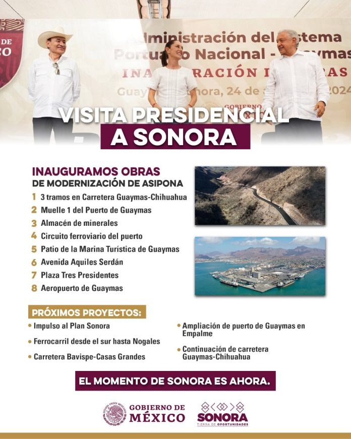 Dentro de las obras inauguradas están 3 tramos en Carretera Guaymas-Chihuahua, Muelle 1 del Puerto de Guaymas y almacén de minerales; además, el Circuito ferroviario del puerto, Patio de la Marina Turística de Guaymas, Avenida Aquiles Serdán, Plaza Tres Presidentes, Aeropuerto de Guaymas
