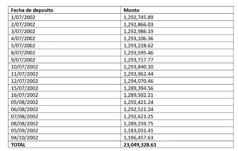 CIUDAD DE MÉXICO (Proceso).- En 18 días, entre julio y septiembre de 2002, Cinthia Aideé Chavira Gamboa recibió depósitos por cantidades cercanas a un millón 300 mil pesos solamente con diferencia de 120 pesos aproximadamente. En total, a la cuenta de la esposa del exgobernador Javier Corral ingresaron 23 millones 49 mil 328 pesos y 61 centavos.