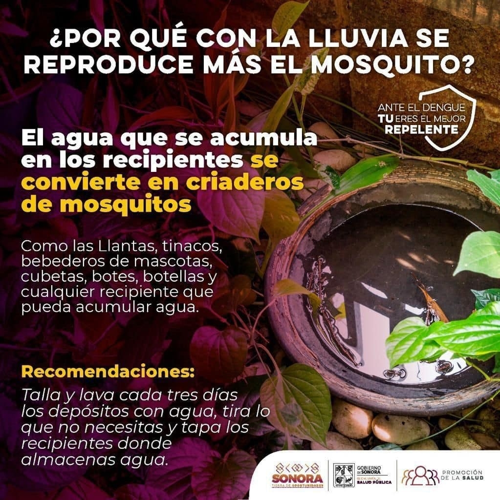 Hermosillo, Sonora; 2 de septiembre de 2024.- Ante la presencia de lluvia en la mayor parte del estado, la Secretaría de Salud (SSP) hizo un llamado a la población a mantener hogares limpios, libres de cacharros y recipientes que almacenen agua, pues estos son el hogar ideal para la reproducción del mosquito que transmite el dengue.