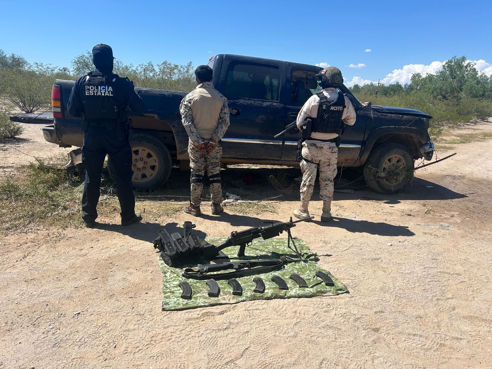 En el ejido El Claro, elementos de la Policía Estatal, Ejército Mexicano, AMIC y Policía Municipal de Santa Ana, realizaron un operativo conjunto en el que aseguró a una persona, así como un vehículo tipo pick up cuatro puertas modelo 2006, un arma de fuego tipo metralladora (Minimi) M24 calibre 5.56 mm, un arma de fuego tipo fusil AK47 calibre 7.62 x 39 mm, seis cargadores metálicos desabastecidos, un cargador metálico abastecido con cartuchos 7.62 x 39 mm y un chaleco balístico.