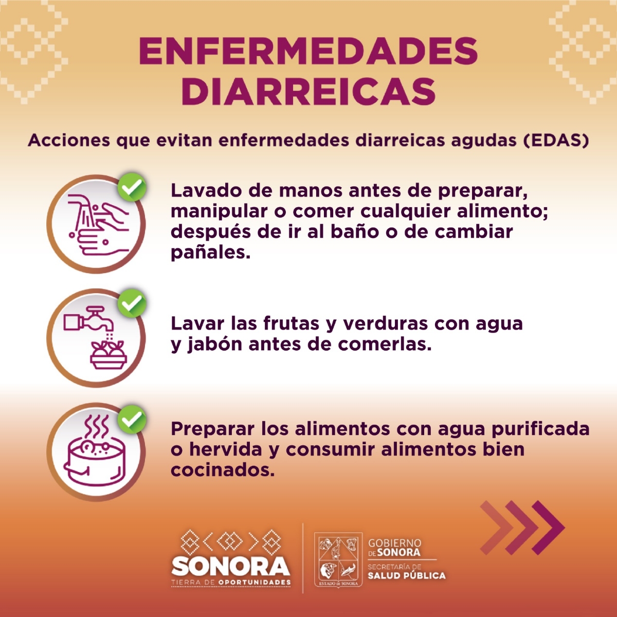 Hermosillo, Sonora; 9 de septiembre de 2024.- Ante las altas temperaturas en la mayor parte del estado, la Secretaría de Salud (SSP) hizo un llamado a la población a prevenir enfermedades diarreicas agudas (EDAS) y cuidar de la población en riesgo, como menores de 5 años y adultos mayores.