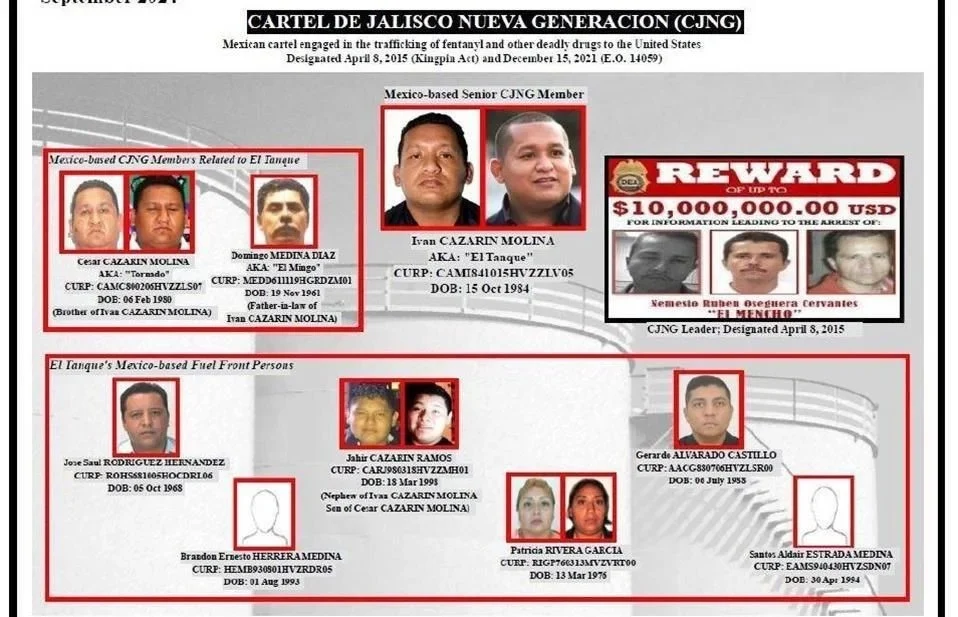 El Departamento del Tesoro de Estados Unidos congeló los bienes de una red de robo de combustible en México, encabezada por Iván Cazarín Molina, “El Tanque”, quien es operador de Nemesio Oseguera Cervantes, “El Mencho”, líder del Cártel de Jalisco Nueva Generación (CJNG).