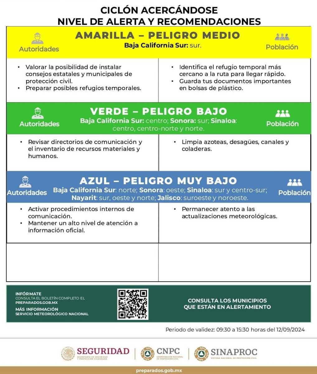 Los municipios que se encuentran en alerta azul son Pitiquito, Hermosillo, Guaymas y Empalme; así como Bácum, Ciudad Obregón, Navojoa, Huatabampo, Benito Juárez, San Ignacio Río Muerto, Etchojoa, Álamos, Rosario y Quiriego, los cuales están en alerta verde.