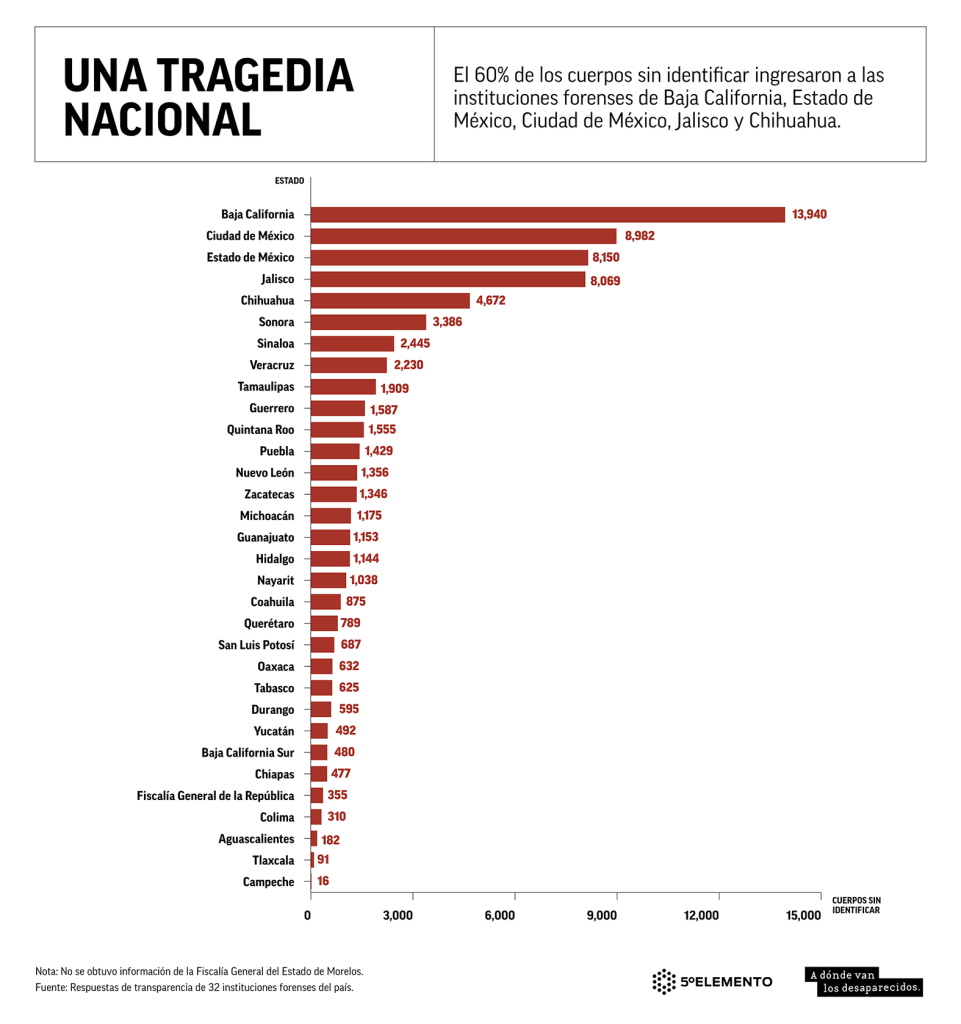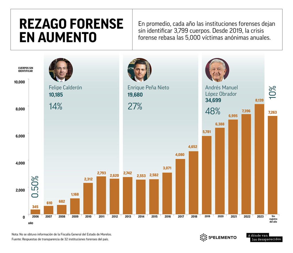 Estas inéditas cifras de cadáveres que permanecen sin identificar, obtenidas por Quinto Elemento Lab y A dónde van los desaparecidos mediante solicitudes de transparencia enviadas a las 32 instituciones forenses del país —solo la Fiscalía General del Estado de Morelos se negó a responder— y a la Fiscalía General de la República (FGR), abarcan los sexenios de Calderón, Peña Nieto y López Obrador.