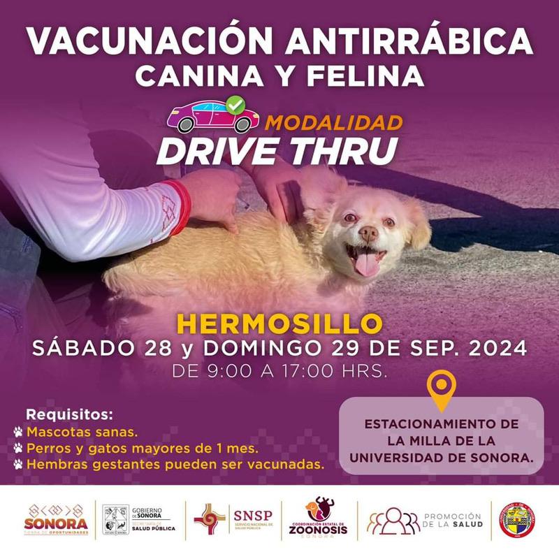 Hermosillo, Sonora; 27 de septiembre de 2024.-La Secretaría de Salud (SSP) inicia este sábado la vacunación antirrábica con modalidad drive thru (auto servicio) en la capital sonorense, esto con la finalidad de inmunizar a la mayor cantidad de mascotas.