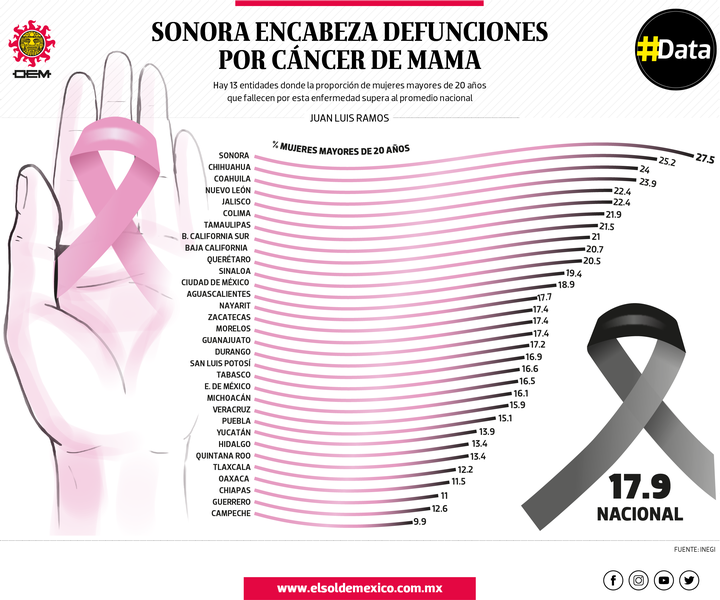 Hay 13 entidades donde la proporción de mujeres mayores de 20 años que fallecen por esta enfermedad supera al promedio nacional https://www.elsoldemexico.com.mx/mexico/data-sonora-encabeza-defunciones-por-cancer-de-mama-12766187.html