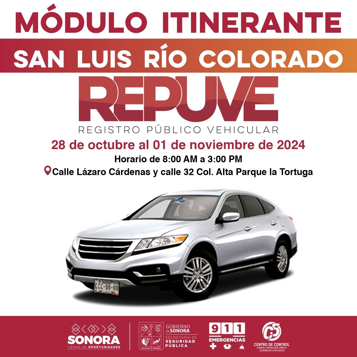 Del 28 de octubre al primero de noviembre, personal del Repuve facilitará el servicio a la ciudadanía en la unidad móvil ubicada en calle Lázaro Cárdenas y calle 32, en la colonia Alta Parque La Tortuga.