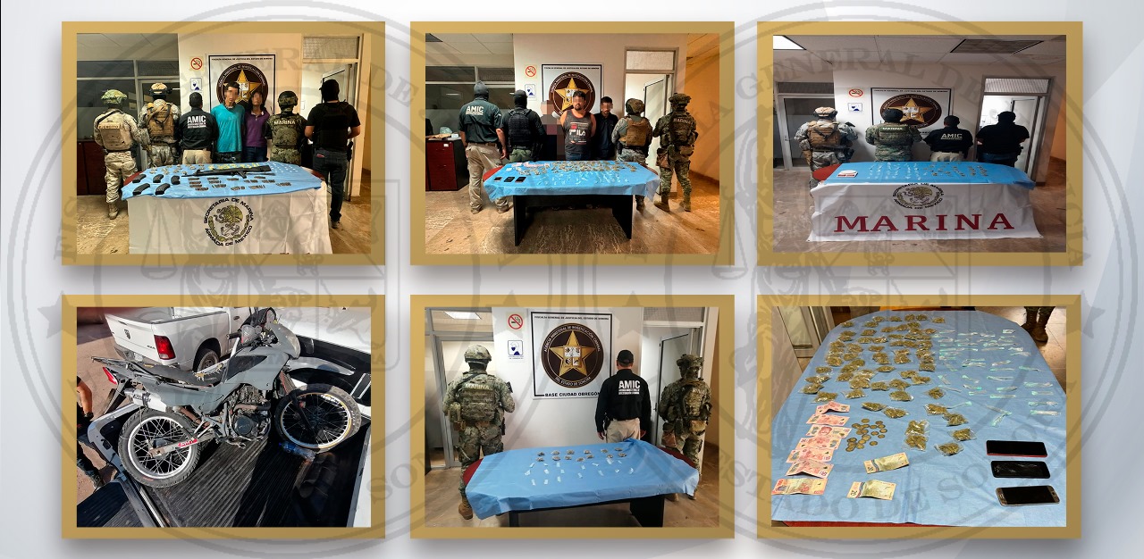 Cajeme, Sonora, 31 de octubre de 2024.- Como parte del “Plan 100 Días Cajeme,” la Fuerza de Tarea Interinstitucional integrada por la Fiscalía General de Justicia del Estado de Sonora (FGJES), Secretaría de Marina Armada de México (SEMAR), Secretaría de Defensa Nacional (SEDENA) y Coordinación Nacional Antisecuestro (CONASE), realizó operativos que permitieron la detención de cinco personas y el aseguramiento de 271 dosis de narcóticos, de las cuales 161 eran de cristal y 110 de marihuana.
