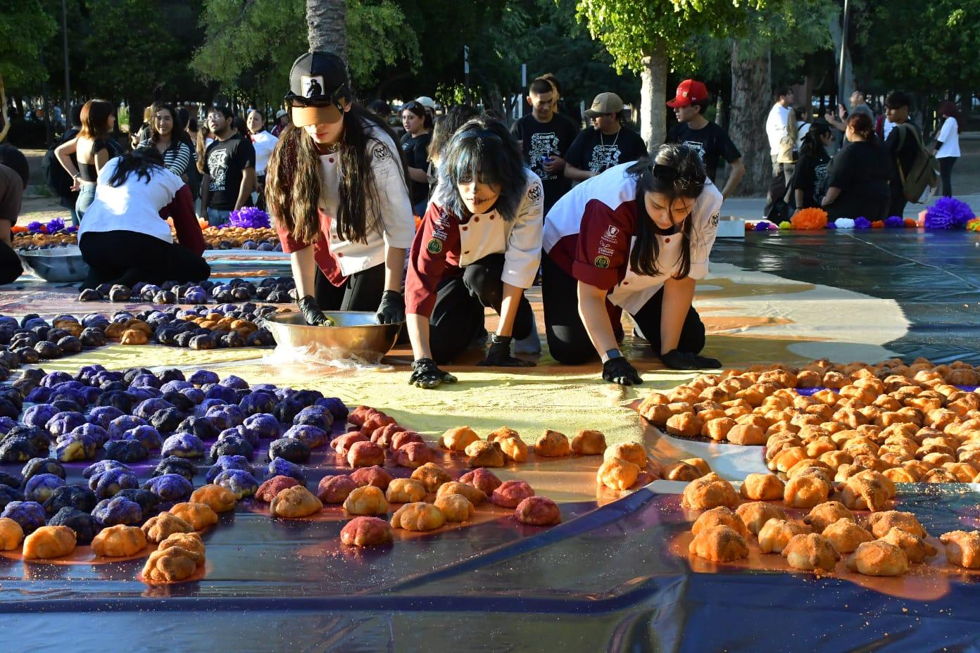 También se sumaron las organizadas en sedes alternas como el Parque La Ruina y el Parque Madero, donde personal y alumnado de la Universidad Vizcaya de las Américas armaron una catrina monumental con 3 mil 500 panes de muerto decorados con azúcar teñida de variados colores.