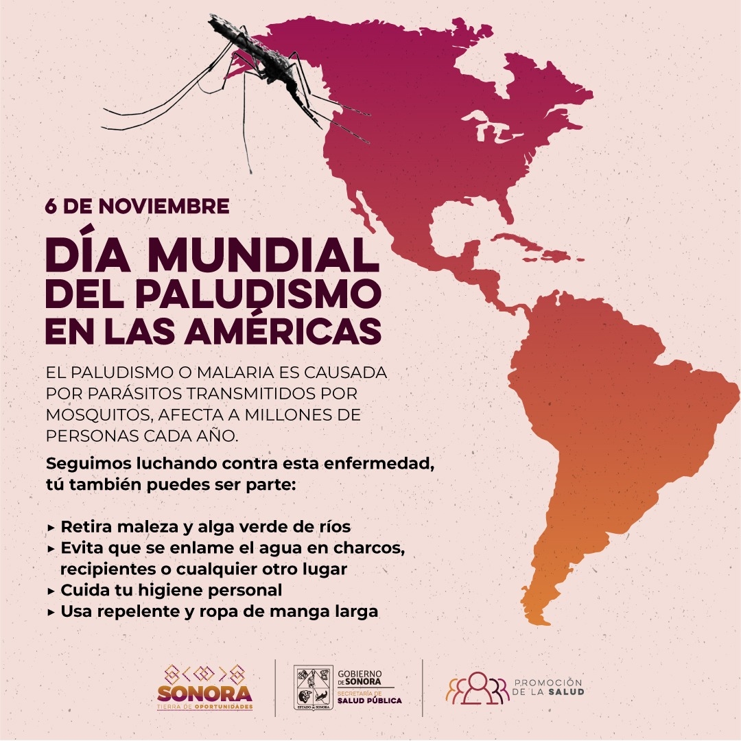 Hermosillo, Sonora; 6 de noviembre de 2024.- En el Día Mundial del Paludismo en las Américas, la Secretaría de Salud (SSP) hizo un llamado a la población a protegerse para evitar esta enfermedad, más aún cuando se viaja a las zonas donde este padecimiento es más común.