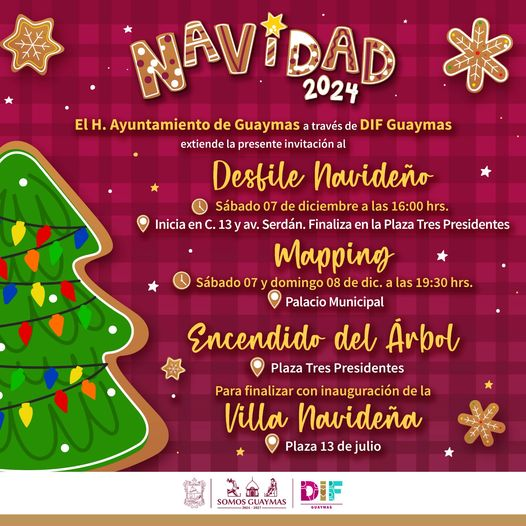Será el sábado 07 de diciembre que dará inicio al programa preparado por DIF Guaymas, siendo la primera actividad el desfile navideño, esto con la participación de 46 grupos escolares, empresas, estudios de danza, Corte Real del Carnaval 2024 y candidatos, UBR, CADI, entre otros, el cual comienza a las 16:00 horas y que recorrerá desde calle 13 y avenida Serdán hasta llegar a Plaza Tres Presidentes, señaló, Alma Delia Guerrero Cornejo, directora de esta dependencia.