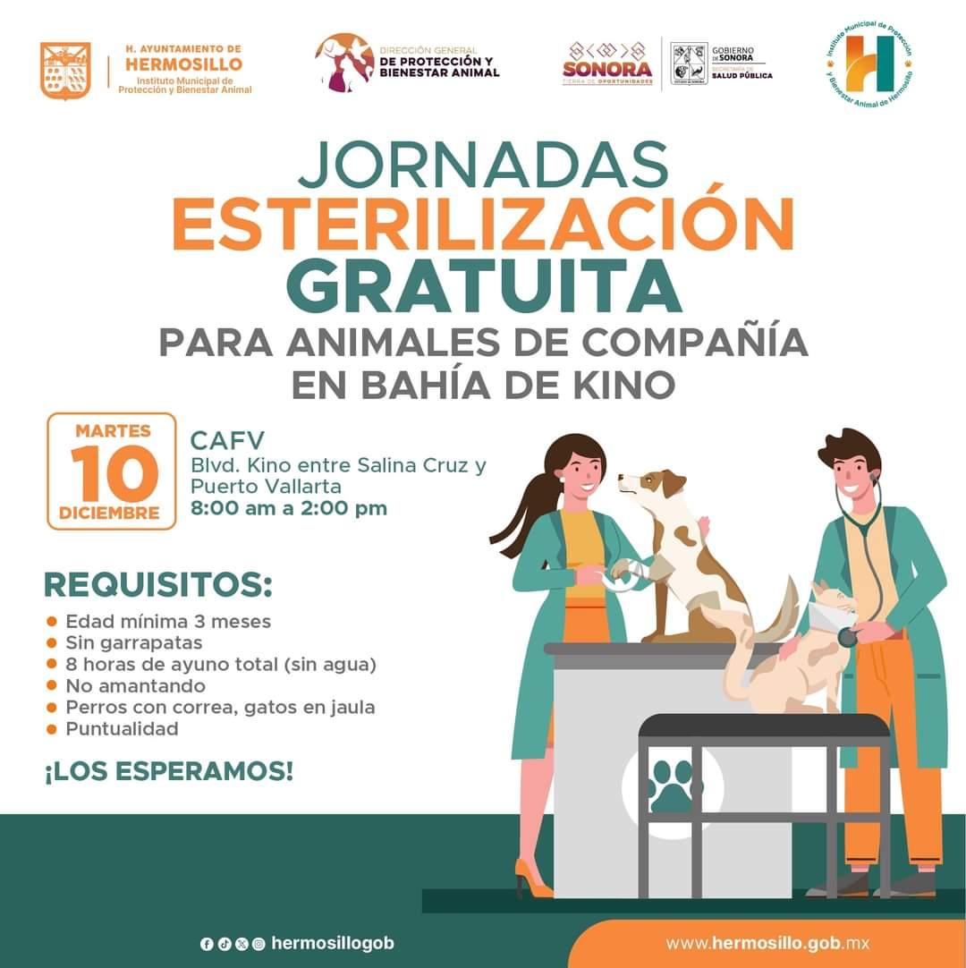“La invitación es muy cordial a todos los habitantes de Bahía de Kino, para que participen y lleven a sus animales de compañía, perros y gatos, este próximo 10 de diciembre, desde las 9 de la mañana hasta las 3 de la tarde aproximadamente, vamos a estar allí atendiendo, concientizando, sensibilizando y difundiendo la gran importancia de esterilizar animales de compañía”, expresó.